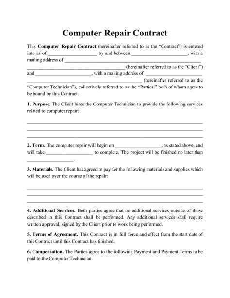 Sign a contract before you begin your work. Web before your next it service call, create your own customized computer service agreement to outline the terms and conditions of your services for yourself. Web here's what you'll find in the computer repair contract template: Computer service contract agreement template for your business or personal use. Web with signatures from both the computer owner and the computer technician, this contract helps each party to set appropriate expectations. Web this computer repair contract template makes it easy to create, send, and sign detailed contracts from anywhere! Web a computer repair contract template is an indispensable resource as you enter into agreements with new clients.