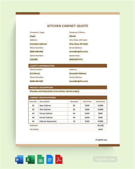 Web essential elements of kitchen cabinet quote template company information: 8 x flat panel cabinets in ‘stone’, 24” x 30”. Web free kitchen cabinet quote template. Includes the company’s name, address, contact details, and relevant licenses or certifications. The shape of your kitchen determines the flow for food prep, clean up, and all other activities. Select the product categories to include within your kitchen remodel estimate. You can access a free word or excel quote template down below:
