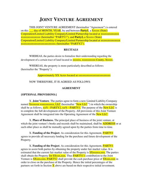 Free Sample Joint Venture Agreement Master of Template Document