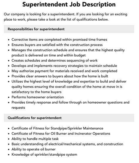 Web professional superintendent job description template. Web set standards in looking for a superintendent of any business with a detailed superintendent job description. Superintendents are in charge of planning and coordinating the activities of. Is one of the leading companies in our field in the area. You can edit this template. Web the project superintendent is responsible for overseeing construction projects from start to finish, ensuring that they are completed. Web construction superintendent job description template. Web update your job descriptions for new vacancies with template.net's superintendent job description. Are you ready to craft a compelling job description to. Web we have included field superintendent job description templates that you can modify and use.